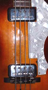 1961-1963 Hofner Beatle Bass: A new horizontal gold script logo decal was used on the headstock Closed pickups were added with the Hofner name inside a diamond. Late 61 saw pickups add adjustment screws. In 62 pickups moved further apart.